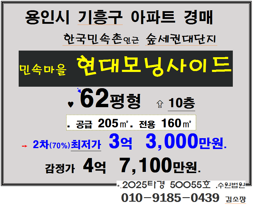| 용인 기흥구 한국민속촌인근 대단지아파트 . 보라동 민속마을 쌍용 51평형 2차경매(25-54438)0306 (0) | 2026.02.16 |